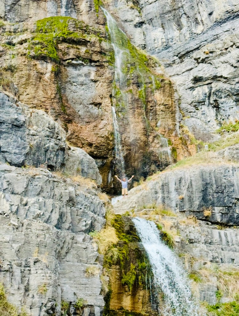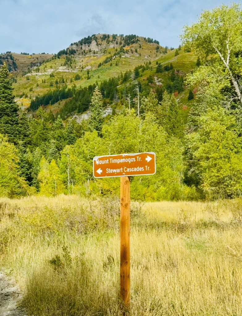 This 3.4-mile round-trip trail, rated moderate, is perfect for families or anyone seeking a scenic escape. By 9 AM, the little parking lot was completely full, forcing us to park well down the street with many others—adding some extra steps before the hike began. The trail weaves through pine and aspen groves, the leaves glowing like embers in the morning light. As we hiked, the distant roar of Stewart Falls grew louder, pulling us toward the 200-foot, two-tiered cascade. When it came into view, sparkling against the autumn backdrop, we stopped in awe.