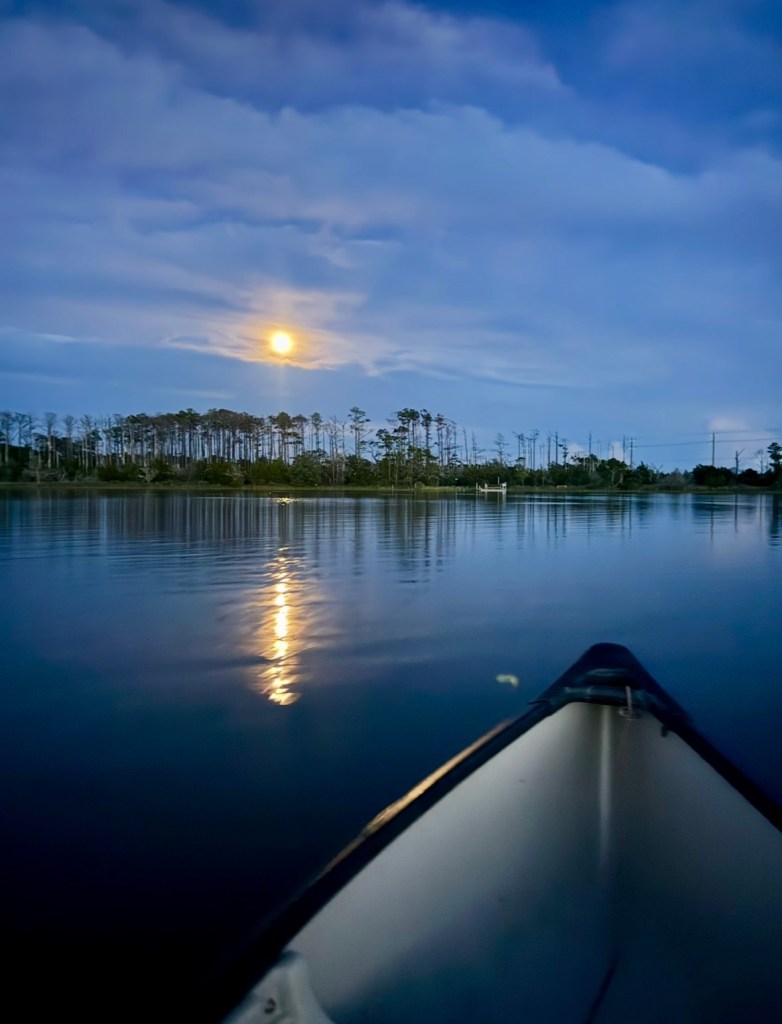 Our adventure kicked off camping in Beaufort, NC, where the Pamlico Sound set the stage for a magical night. On September 6, 2025, the night before the full moon, we canoed under a nearly full, silvery glow, tiny frogs bobbing like lanterns on the water’s surface, their croaks a nighttime symphony. It was a spellbinding start, like gliding through a starlit dream, priming us for our Outer Banks escape.