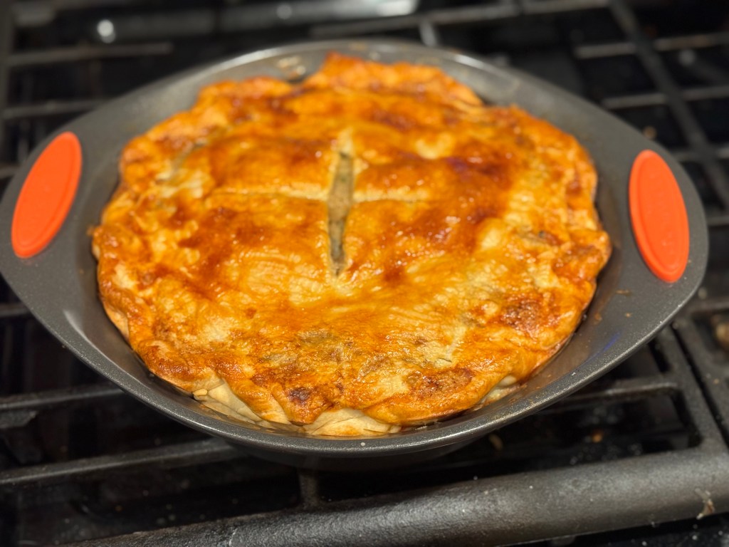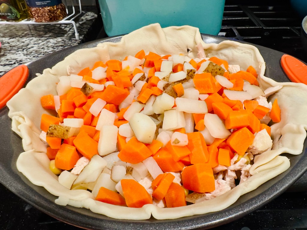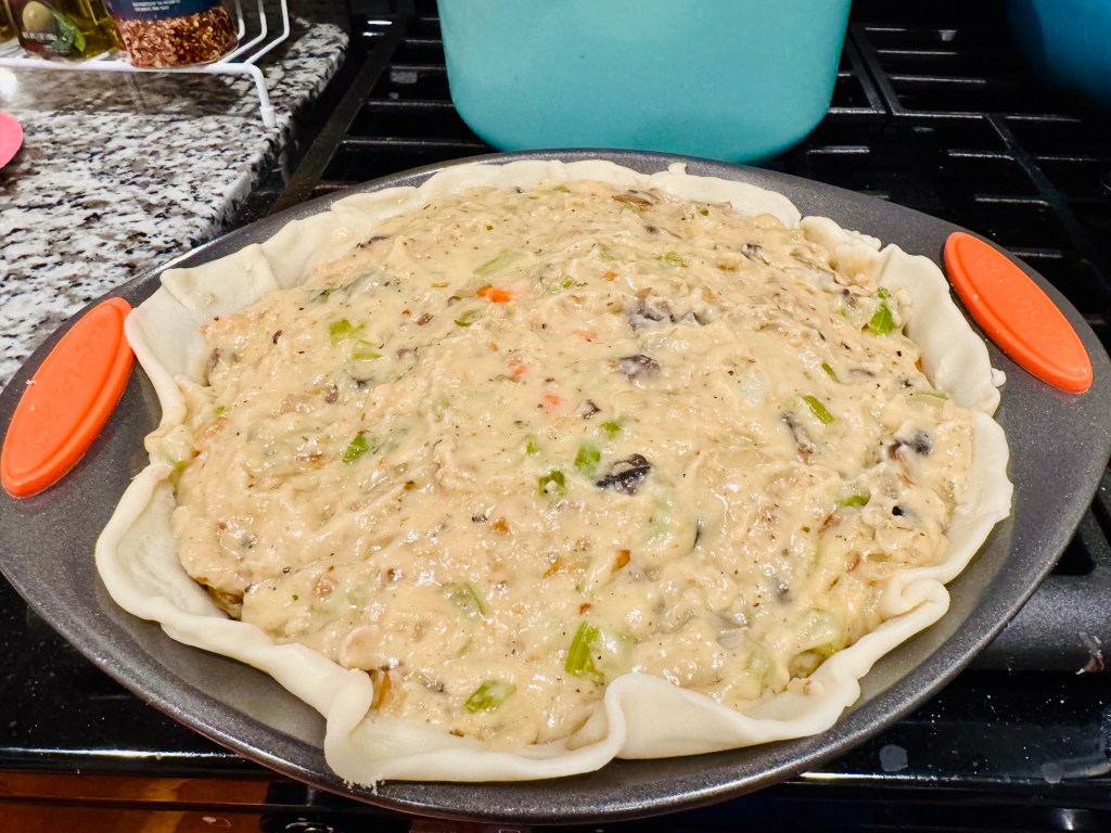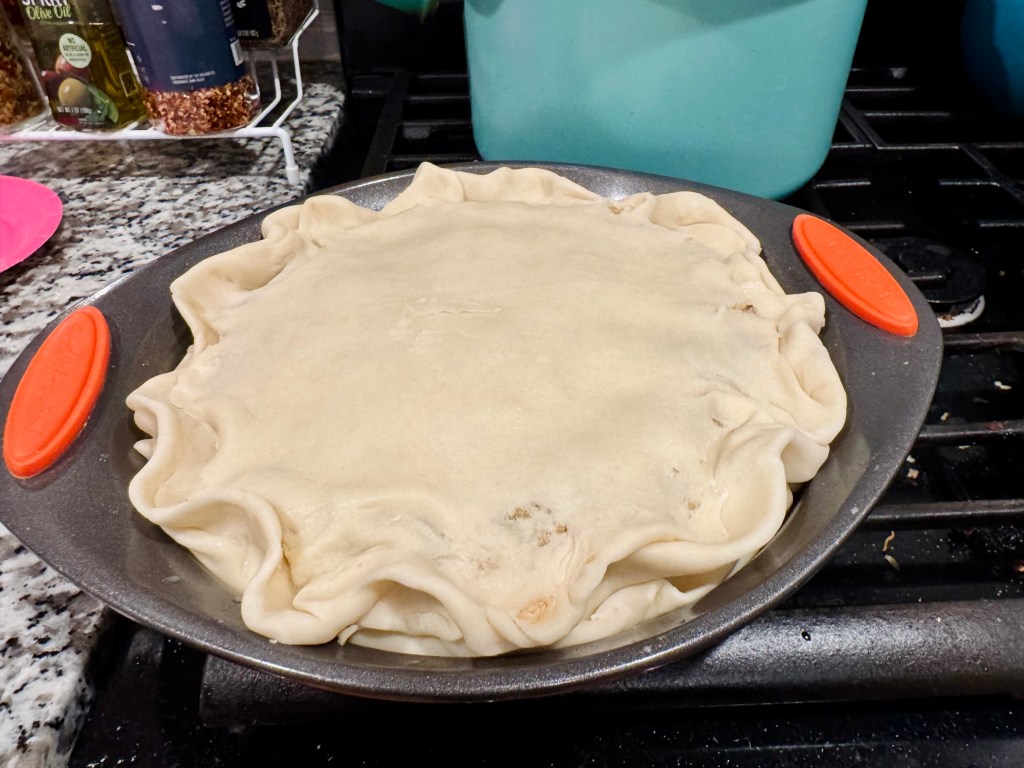 Pour sauce over chicken and veggies (don’t stir). Top with second crust, tuck edges under, and crimp. Brush with egg wash. Cut an “X” in the center for steam.
