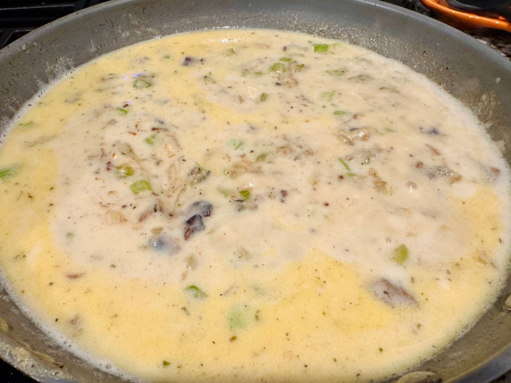 Wipe pan, melt 2 Tbsp butter, and sauté onion 5–7 minutes until soft. Add remaining 3 Tbsp butter; once melted, stir in flour, celery seed, salt, and pepper. Slowly whisk in broth and milk. Simmer, stirring, until thickened (like a cozy gravy). Taste and adjust salt.