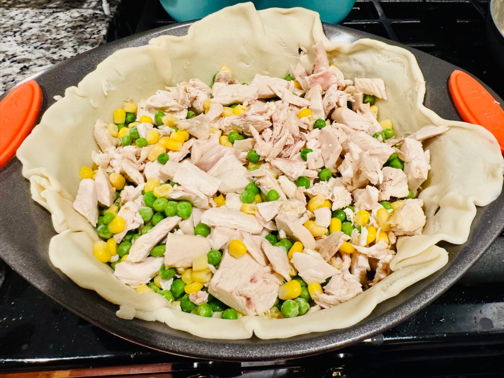 Fill crust with shredded chicken, frozen peas, and corn. Set aside.
