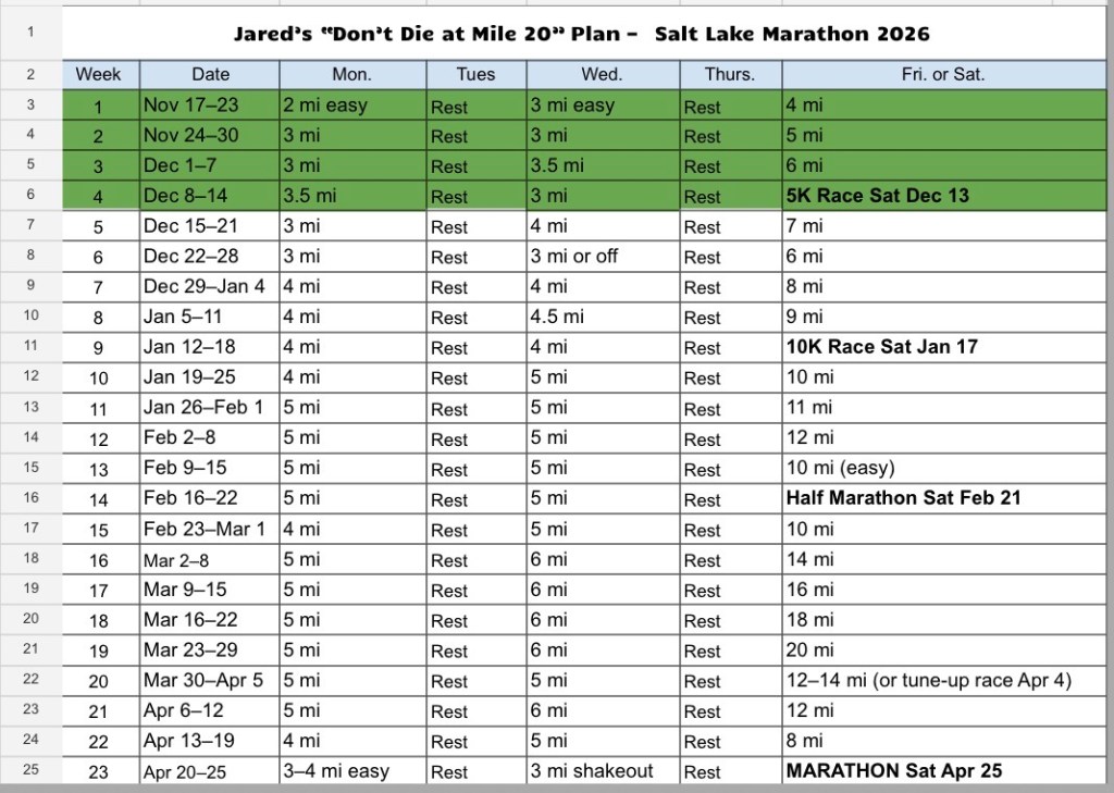 One of the best decisions I’ve made so far is following a clear running schedule (huge shout-out to Grok for helping me put it together). Having a plan removes decision fatigue. I don’t wake up wondering if I should run or what I should do—I already know. I just lace up and go.